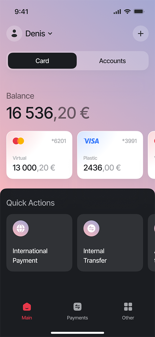 Easily manage your cards, payments, and accounts in one place. Monitor balances, review transactions, add virtual cards to your wallet, and move funds with full visibility — all within a simple, intuitive app.